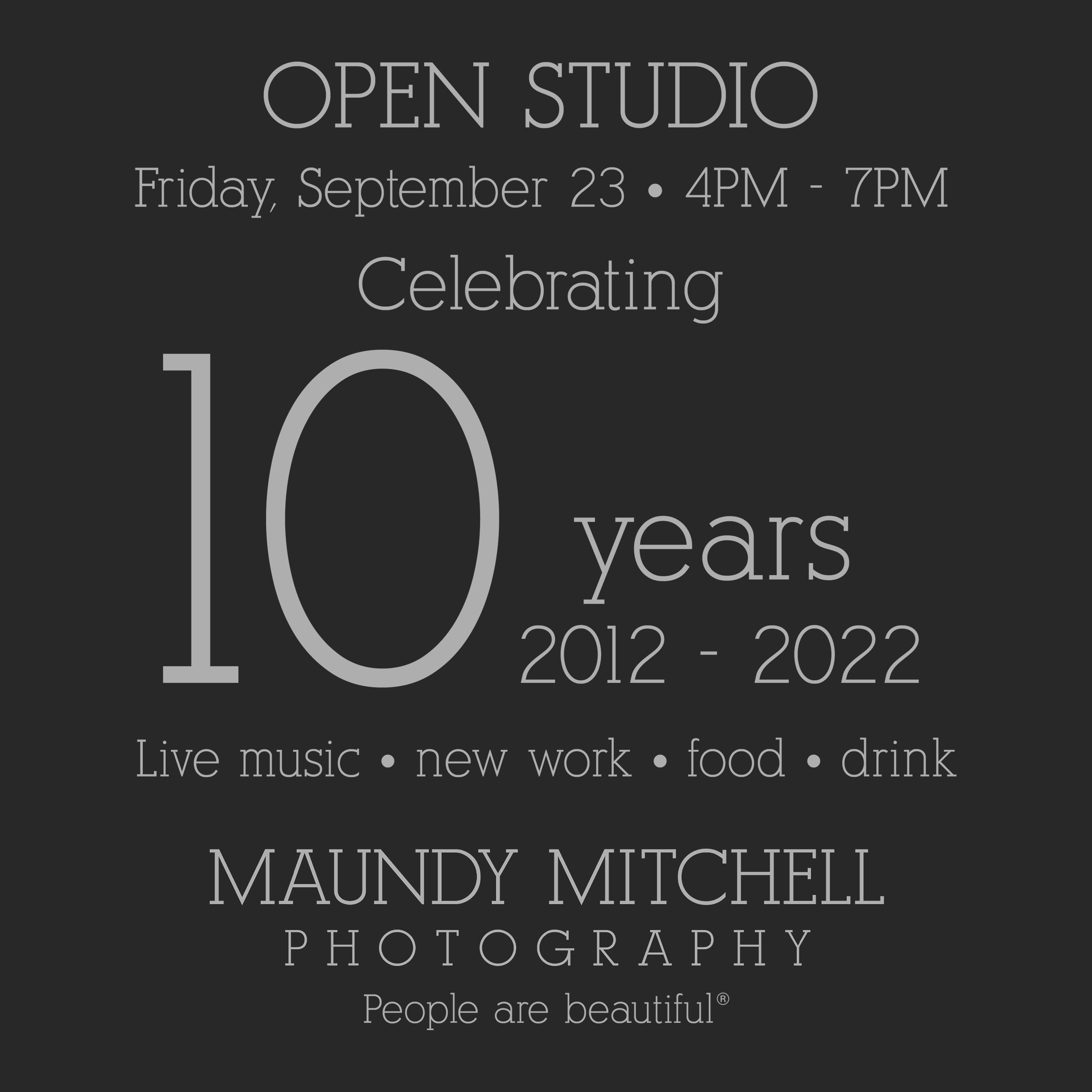 You’re invited! Please join Maundy for an open studio to celebrate ten years in business! Stop by Maundy Mitchell Photography, 62 Main Street, Plymouth, NH, on September 23, 2022, between 4:00 and 7:00 p.m. Tour the studio. Enjoy live music (saxophone on the sidewalk by Mark Flynn!), visit with friends, and see new work. Have a glass