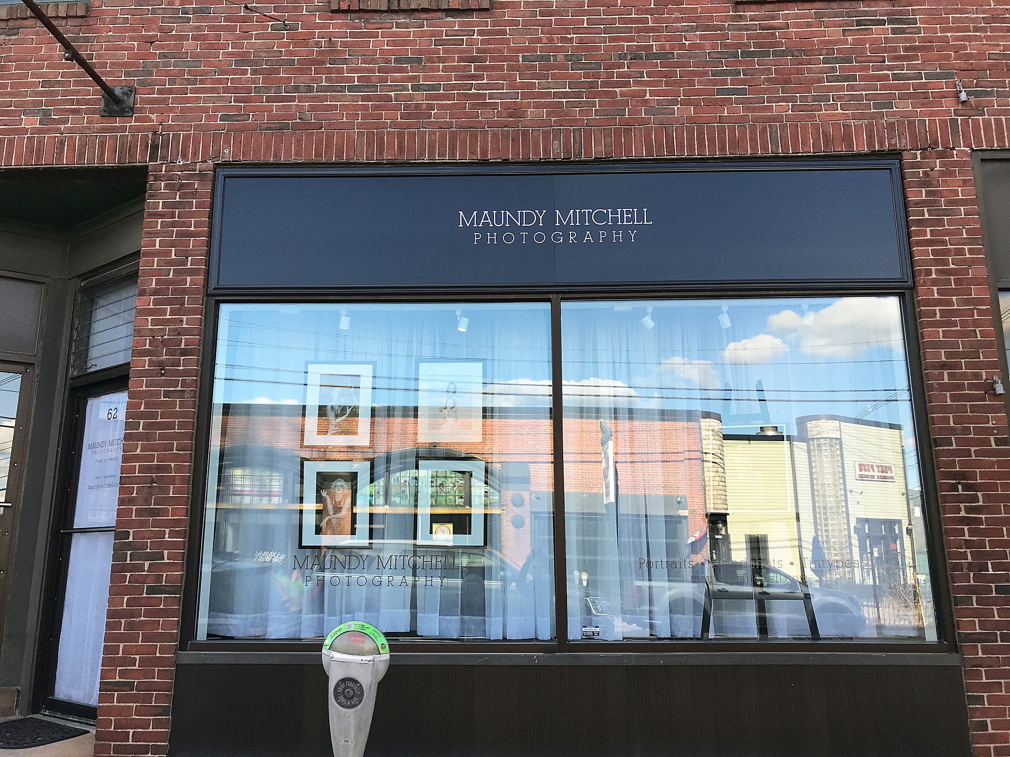 The new signs are up! Last week, Lincoln Sign Company installed the new signs on my storefront studio – just in time for Friday’s New Studio Open House. For the main sign, I chose a smallish silver logo on a black background with a simple crown moulding. For the window decals, dark gray metallic lettering.