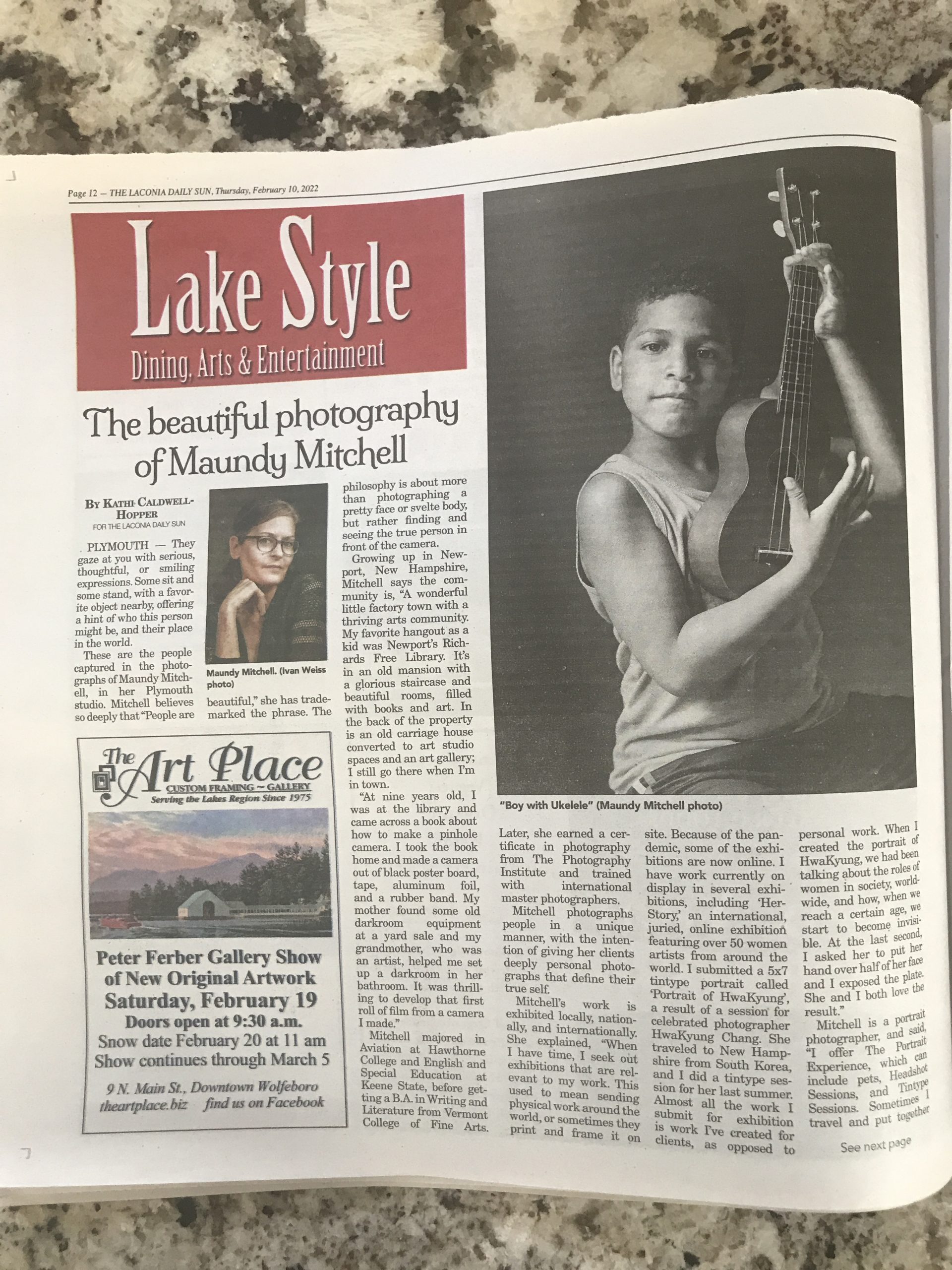 Thanks to The Laconia Daily Sun & Kathi Caldwell-Hopper for a lovely, two-page article in the paper last week about me and my work. Kathi is a great interviewer. She asked me about my education and influences, how I got started in photography, how I serve my clients, and what exhibits I currently have work