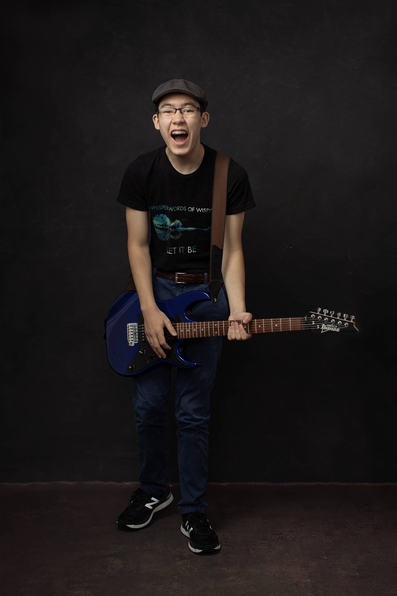 My son, David, turns fourteen today. Each year he wants to do a few portraits for his birthday. In March his school went online because of the pandemic. He started playing his guitars more, especially this electric one. For his birthday photos this year, he described the look he wanted, and he chose the dark