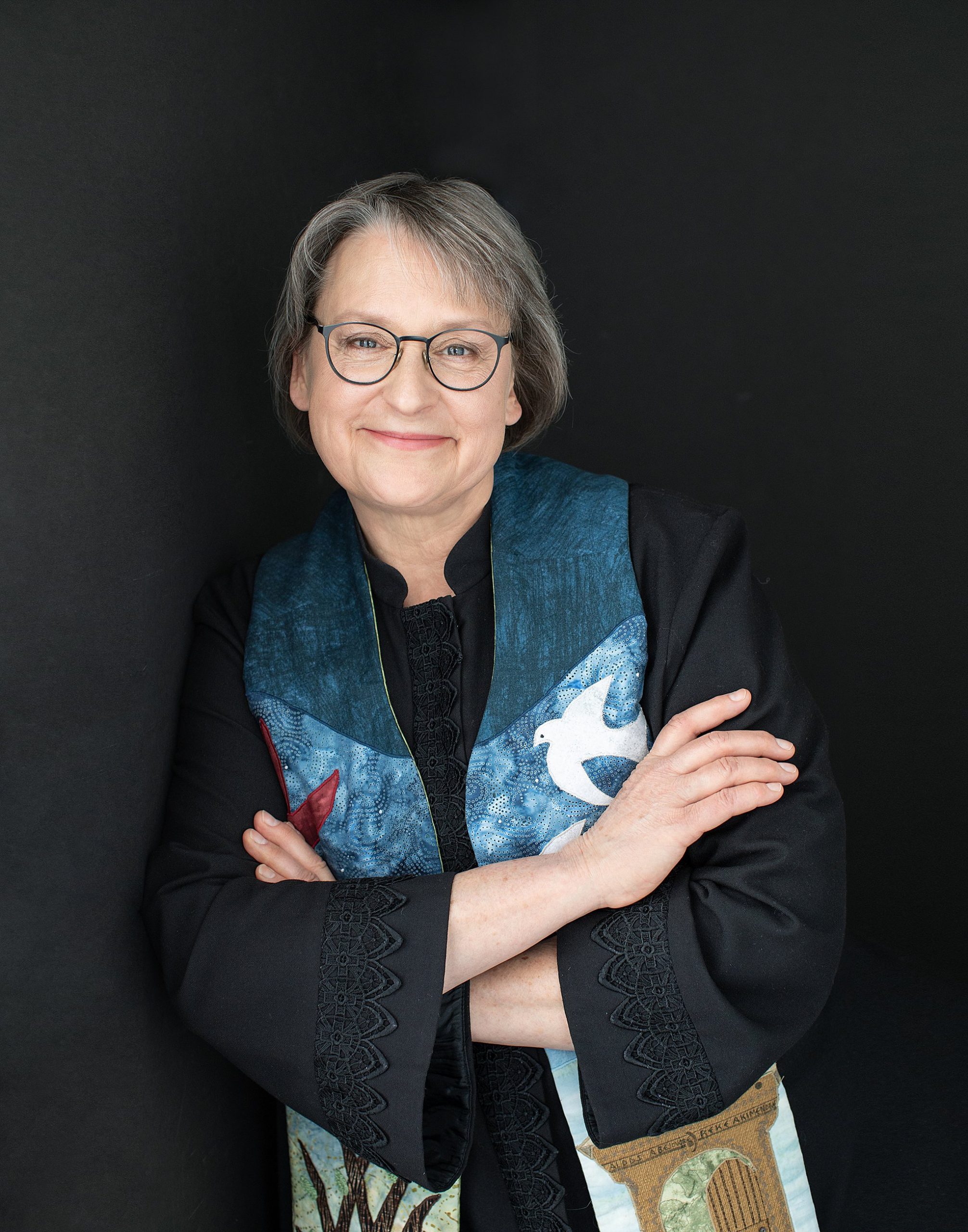 Rev. Dr. Linda Barnes is the minister of Starr King Unitarian Universalist Fellowship in Plymouth, New Hampshire. She’s been there four years, having moved from the mid-west. Recently, she needed to update her headshots – she couldn’t put it off any longer! She brought her cleric robe, along with two handmade stoles. The first was
